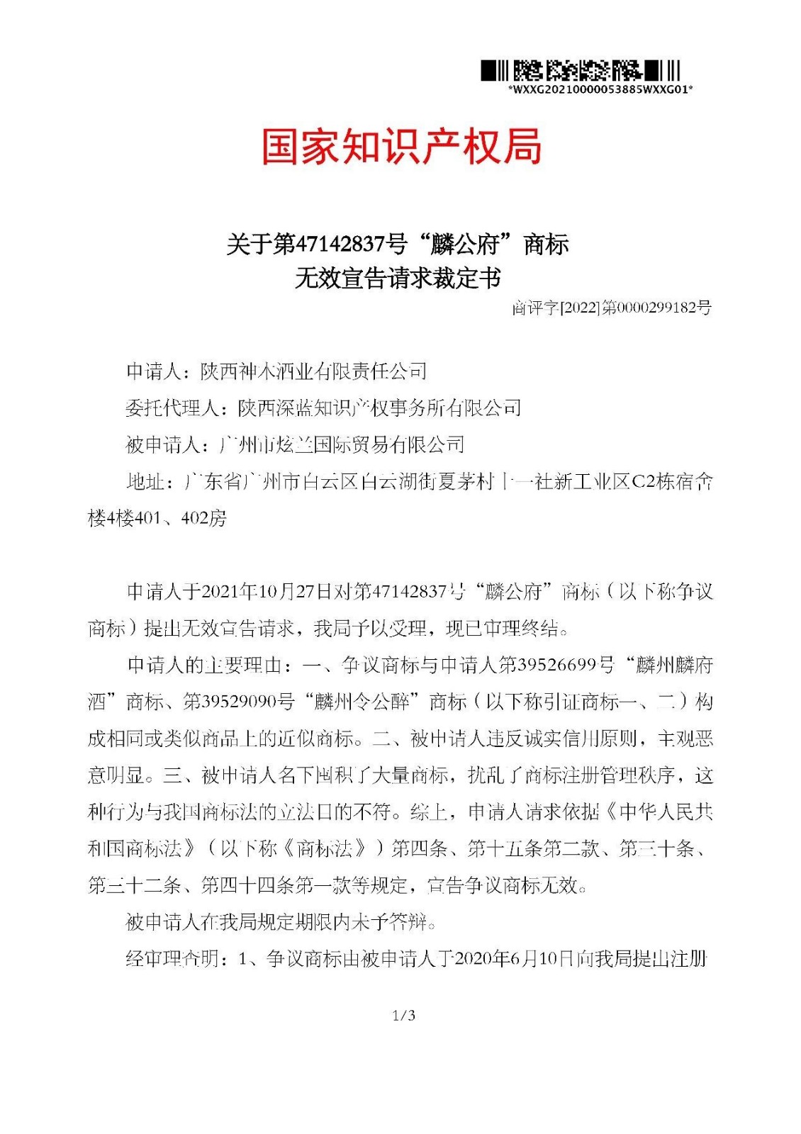 广州市炫兰国际贸易有限公司于2021年2月7日在酒类上成功注册了“麟公府”商标,与我所客户陕西神木酒业有限责任公司生产销售的“麟州令公醉”白酒以及“麟州麟府”白酒商标近似程度高,若放任其不管,将会对我客户陕西神木酒业有限责任公司的商标产生巨大的影响,严重弱化品牌形象,扰乱市场秩序,将会对神木酒业相关品牌白酒的销售,造成不可估量的巨大经济损失。