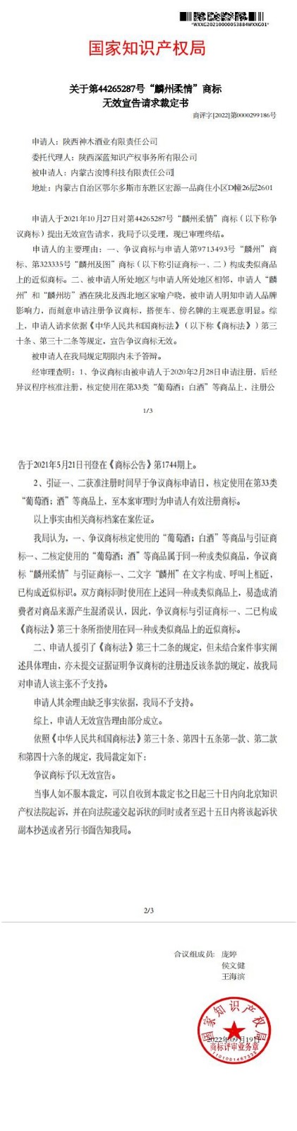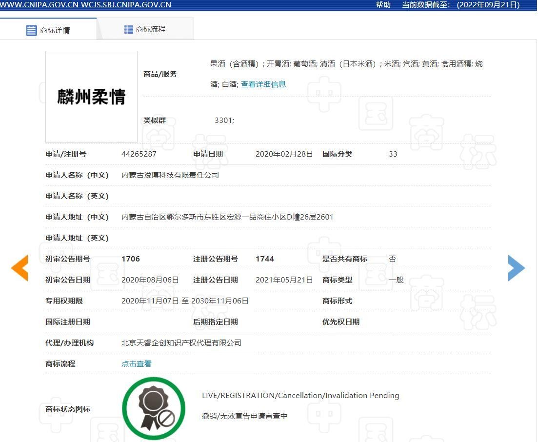 国家商标局受理申请后,经过审理查明,认为:争议商标核定使用的“葡萄酒;白酒”等商品与引证商标一、二核定使用的“葡萄酒;酒”等商品属于同一种或类似商品,争议商标“麟州柔情”与引证商标一、二文字“麟州”在文字构成、呼叫上相近,已构成近似标识。双方商标同时使用在上述同一种或类似商品上,易造成消费者对商品来源产生混淆误认,因此,争议商标与引证商标一、二已构成《商标法》第三十条所指使用在同一种或类似商品上的近似商标。