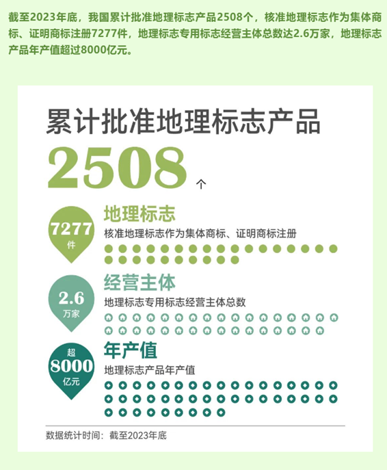 对于产品,可以申请商标,并且带有地理标志的产品一定程度上了加大了影响力, 对产品的意义较大。下面是截至23年底,国家知识产权局关于地理标志的统计数据,深蓝知产在此给大家介绍一下地理标志商标与普通商标的区别。地理标志的构成要素是叙述性文字,它直接以地理名称说明商品的地理来源,暗示商品所具有的特定和优良品质,而商标的构成要素呈多样化,包括文字、字母、数字、图形、三维标志,甚至是颜色的组合等,主要是从视觉上的可视性进行强调。地理标志的构成一般要求是"地理名称+商品名称",构成较为简单。地理标志标示商品源自“何处”,商标则表示商品源自"何人"。2、地理标志与商标的注册两者权利获得的前提条件不同商标权的获得是以商标的注册为先决条件,注册商标权产生于注册。地理标志获得保护的前提是已经非常有名气的某一特定的商品,并且其内在特有的质量、声誉和其他特征与该特定的地域密切相关,注册只是对已经存在的这种权利的进一步确认。因此,地理标志注册不是权利产生的前提,而是一种公示宣告、一种权利确认。商标有效期为10年,要使商标继续受到保护,权利人必须进行续展。而地理标志具有永续性,不受时间的限制。商标是先申请批准注册,再积累商品声誉形成无形资产,而地理标志却是先进行多年历史积累,再申请核准登记,追认为知识产权。现行的地理标志保护制度更多地是从国家和社会公众利益出发,所以其保护方式是"禁",即更多地是以反不正当竞争法、产品质量法等经济法加以规范,而商标的保护则是落实在私法方面,其保护方式是"行禁并行",即以商标法为核心加以保护,同时辅以竞争法、产品质量等经济法加以保护。1、以地理标志作为证明商标注册的,其商品符合使用该地理标志条件的自然人、法人或者其他 组织可以要求使用该证明商标,控制该证明商标的组织应当允许。2、以地理标志作为集体商标注册的,其商品符合使用该地理标志条件的自然人、法人或者其他 组织,可以要求参加以该地理标志作为集体商标注册的团体、协会或者其他组织,该团体、协会或者 其他组织应当依据其章程接纳为会员;不要求参加以该地理标志作为集体商标注册的团体、协会或者 其他组织的,也可以正当使用该地理标志,该团体、协会或者其他组织无权禁止。3、商标法十六条规定商标中有商品的地理标志,而该商品并非来源于该标志所标示的地区,误导公众的,不予注册并禁止使用;但是,已经善意取得注册的继续有效。